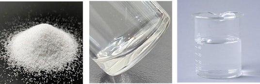 図1.アメーバハイドロゲルの外観。左:乾燥後のゲル粒子。中:ハイドロゲル。右:水中に希釈分散されたハイドロゲル。