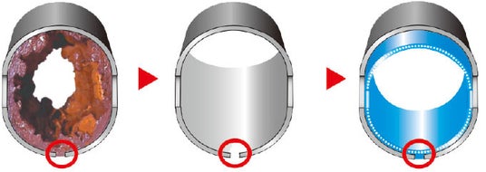 それらを解消するのが、当社が開発したFRPライニング工法です。本工法は、既存配管の内側に特殊クロスと樹脂を用いて新たなパイプを内部形成する特許技術です。壁を壊さず施工できるため、居住者の退去が不要で工期短縮・コスト抑制・廃材削減が可能で、公共施設・団地・病院など幅広く採用されています。