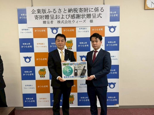 左:かつらぎ町長 中阪 雅則氏、右:有限会社アクアテック 代表取締役 大和田 健斗