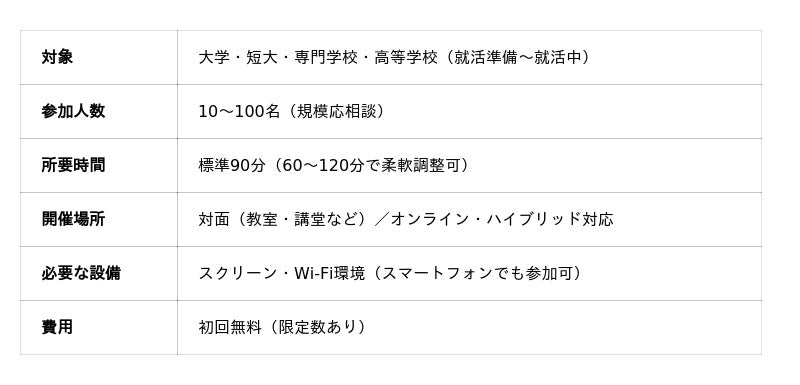 対象: 大学、短大、専門学校、高等学校のキャリアセンターまたは教員