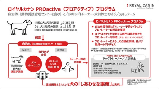 栄養学に基づいて犬と猫の健康を実現する企業(Health Through Nutrition Company)として、プレミアムペットフード および食事療法食を展開するロイヤルカナン ジャポン(本社:東京都港区、社長:日下部 真一、以下、ロイヤルカナン)は、環境省による人と動物の共生パートナーシッププロジェクト「つなぐ絆、つなぐ命」の一環となる「ロイヤルカナンPROactive(プロアクティブ)プログラム」(以下、「PROactiveプログラム」という)を通じて、自治体(動物愛護管理センターを含む、以下「自治体等」という)に向けたドッグトレーナー・犬訓練士の専門家派遣を開始しました。