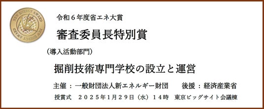 日本国内では、掘削技術者が不足しているおり、この技術者不足の解決策として掘削技術の専門学校を開校し、日本人技術者の養成をおこなっている。掘削技術者の人材不足という課題に対し、教育コンテンツも含め全く新たに教育機関を立ち上げた点及び多くの卒業生が地熱関連会社に就職しており地熱事業を支えている点が評価をいただきました。