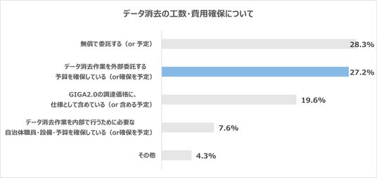 GIGAスクール端末の処分やデータ消去のための予算を確保できている教育委員会は27.2%と、半年前(28.8%)からほぼ横ばいで、データ消去を内部で行うために予算確保している(予定している)と合わせて34.8%。前回調査同様、約3分の1程度にとどまりました。適切な処分・データ消去ができない理由として「予算が確保できない」と回答した自治体も約1割存在します。外部委託を進めるには自治体内の予算措置に加え、国による支援を含め令和8年度、9年度予算での十分な財源確保が求められます。