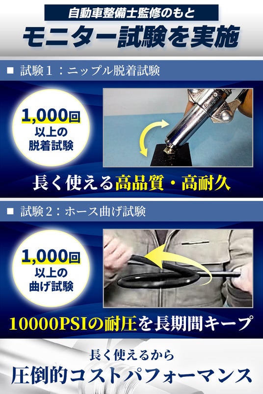 国家資格2級自動車整備士/自動車検査員が現場目線で開発。モニター試験で高品質・高耐久を実証。