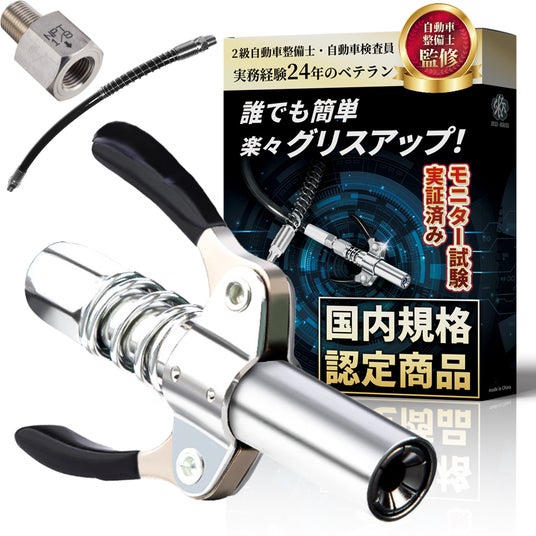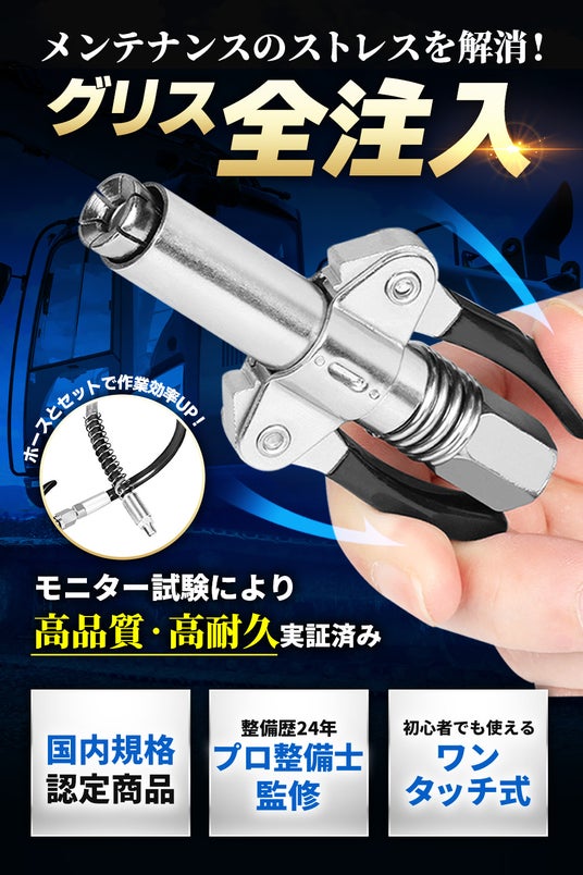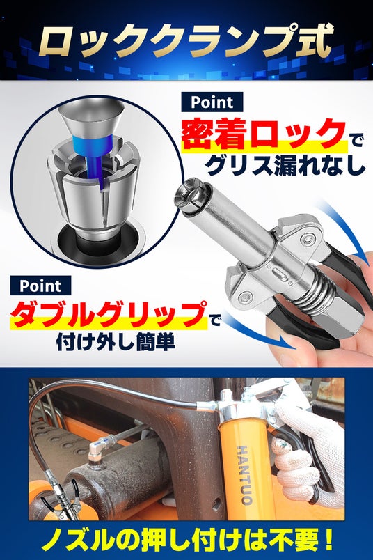 登録済み意匠により密着ロックでグリス漏れを防止。6爪ダブルグリップがニップルを確実にキャッチし、ノズルを押し付ける必要なし。漏れ・外れ・グリス飛散を大幅軽減。初心者でも安心。