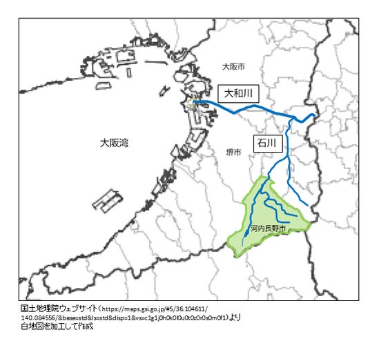 市内には、水質AA類型・生物A類型に指定されている石見川を含む5つの河川が流れ、その源流域はすべて市内にあります。河内長野市に降り注ぐ雨は豊かな森林を通じて河川に流れ込み、1級河川の石川や大和川を通じて、堺市や大阪市などの都市部へ、そして大阪湾へと流れていきます。