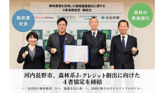 令和7年11月20日、河内長野市(大阪府)は、森林由来のJ-クレジット創出に向け、クリエイション株式会社、住友林業株式会社、NTTドコモビジネス株式会社の4者で連携協定を締結しました。 森林由来のJ-クレジット創出は大阪府で初。