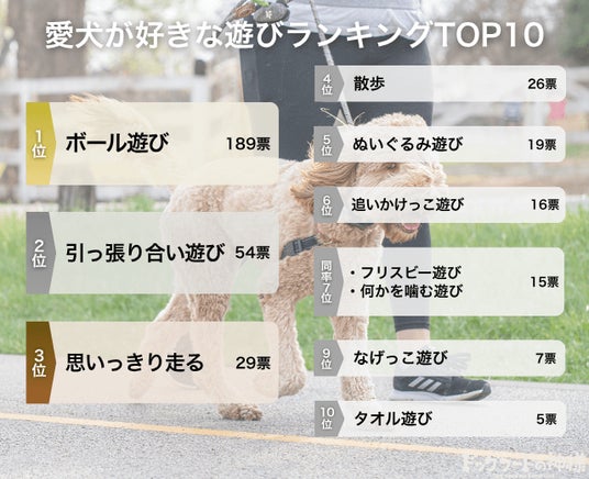 - しかし同時に、嫌いな遊びでも「ボール遊び」が1位という意外な結果も。王道の遊びだからこそ、多くのワンちゃんが試しており、好みが分かれた結果だと予測できる。