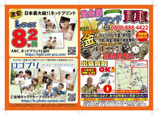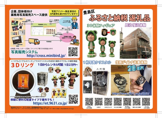 チラシでは、都内最大級の日産25万枚処理能力を誇る写真現像、フランスのデジザイア社と提携し全国展開する3Dホームスタジオ、全国SEとの協業による画像処理システム開発、豊島区・練馬区を中心に展開する民泊運用(50室)、そして銀貨や時計などの出張・宅配買取事業を紹介しています。