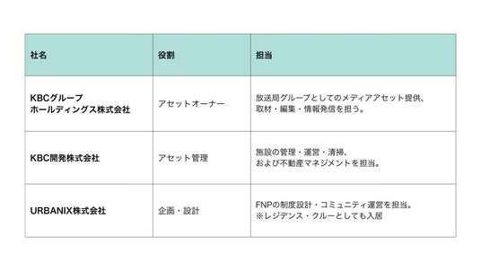 FNPでは、参画したPORT CREWと、KBCグループのリソース(テレビ・ラジオ等のメディア露出、場所、人、空間、事業アセット)を掛け合わせた「実験的な不定期イベント」を開催します。現在、構想中のアイデア(仮)を一部、ご紹介させていただきます。