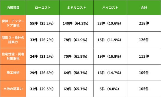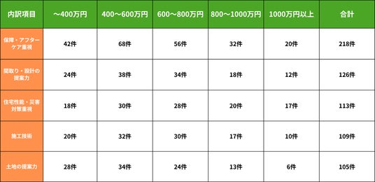 ・一方、建物本体価格2,000万円以下を希望するローコスト提案の層では、「保証・アフターケア」や「施工技術」など、安心して任せられる信頼性やコストバランスを重視する傾向が見られました。限られた予算の中でも、将来的な安心やリスク回避を重視する志向がうかがえます。
