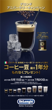 デロンギ・ジャパン株式会社(本社:東京都千代田区 代表取締役社長:杉本敦男)は、2015年をもって日本法人設立20周年をむかえることを記念し、5月15日から7月20日まで、デロンギ『アニバーサリーキャンペーン』を実施いたします。