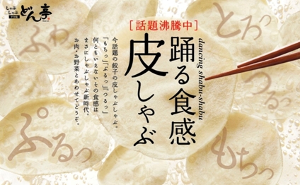 株式会社アークミール(東京都北区赤羽南1-20-1、代表取締役社長:長岡祐樹)は、2015年12月8日(火)からしゃぶしゃぶどん亭にて「踊る食感・餃子の皮しゃぶ」を提供致します。近年、2つのメニューを掛け合わせて楽しむ事が流行の兆しを見せている中、しゃぶしゃぶどん亭では最近話題の餃子の皮Xしゃぶしゃぶをお店で楽しんで頂けるよう、期間限定で提供致します。