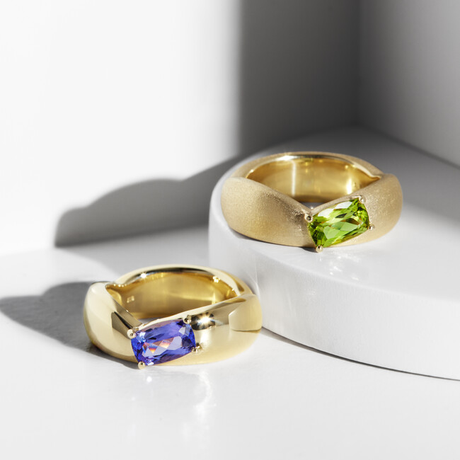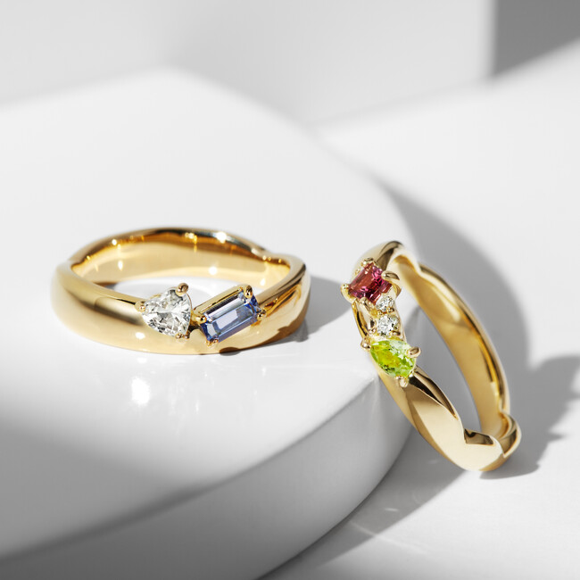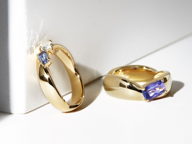 「Ar」は、カラーストーンの楽しさと華やかさ、そしてメタルのしっとりとしたセンシュアルな印象を融合させた全5型のデザインで展開されます。ブルーサファイア、ホワイトサファイア、タンザナイト、ペリドット、ロードライトガーネット、ダイヤモンドなどの天然の宝石を使用し、それぞれの色、サイズ、カッティングの特徴を引き立てるように、丁寧に組み合わせて仕立てています。