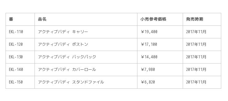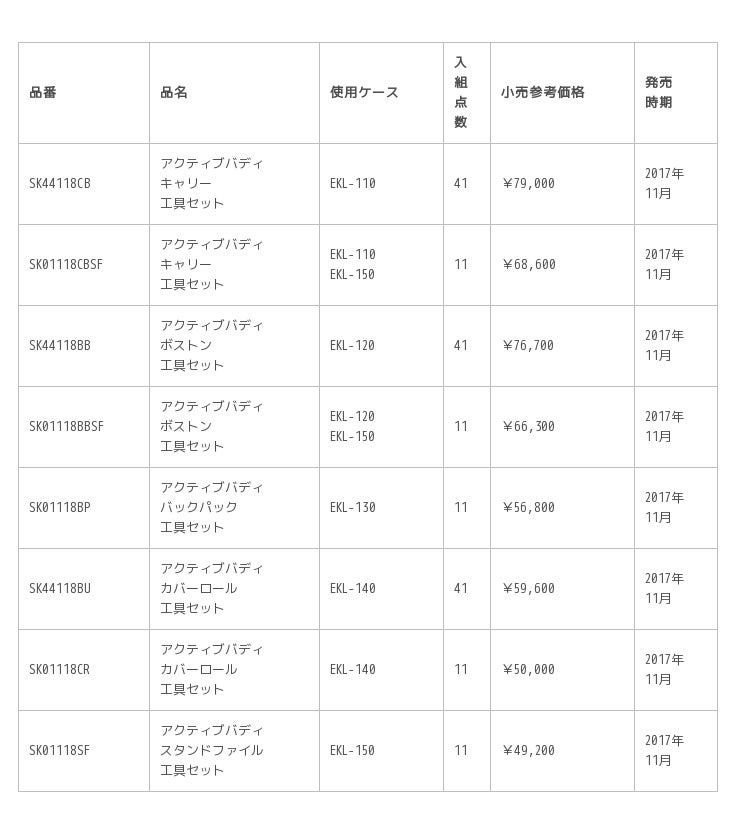 「アクティブバディ」シリーズは、工具を現場に持ち運び作業するフィールドメンテナンスに最適な工具収納具です。メイン素材に化繊布や樹脂を採用し軽量化を実現。キャリーバッグタイプやバックパックタイプなど、携行性を重視したアイテムをそろえました。また、ポケットや仕切り、専用トレイなどにより収納性や作業性も高く、作業工具や保護具、パーツ類、関連書類などを現場までストレスなく携行し、さらに作業を効率的に行えます。「アクティブバディシリーズ」は、容量や携行スタイルの違う6タイプをラインナップし、多様な作業シーンに対応。2017年11月1日より始まる「2017SKセール」対象品として、ケース単品5アイテム、工具セット9アイテムの計14アイテムを発売します。