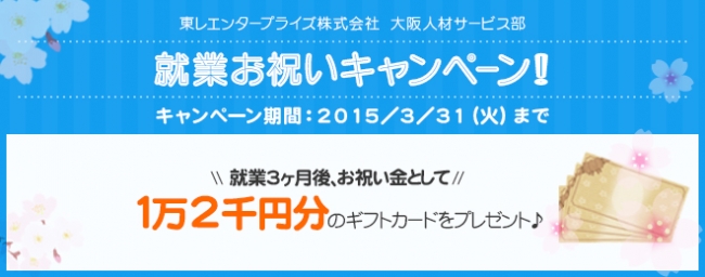 東レ株式会社100%出資会社である東レエンタープライズ株式会社大阪人材サービス部(本社:東京都中央区日本橋)は、就業が決定された方へキャンペーンを実施中です!