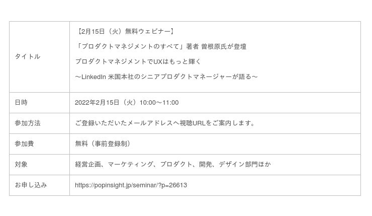 株式会社メンバーズ(本社:東京都中央区、代表取締役社長:剣持 忠)の社内カンパニーであるポップインサイトカンパニー(本社:東京都中央区、カンパニー社長:久川 竜馬)は、プロダクトマネジメントとUXについてご紹介するウェビナーを2月15日(火)に開催いたします。