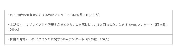 ※2 2018年3月12日~3月19日の間、スクリーニング調査において「最近1年間に、ビタミンCの摂取を目的に、サプリメントや健康食品を自身で購入して飲んだ/食べた」と回答した人に対して、webアンケートを実施。男女比、および年代性別カテゴリ比ができるだけ均等になるようサンプリングした。