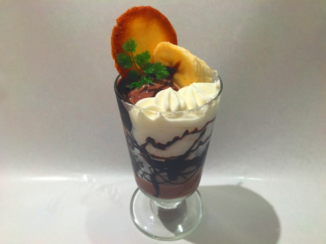 特長:チョコレートのクランブル、バナナ、チョコレートアイスを重ね、まわりにチョコレートソースをあしらい華やかに仕上げた、チョコレート好きにはたまらないパフェです。