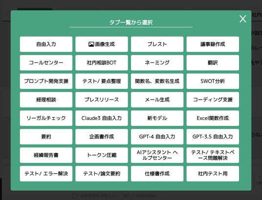 これらのタブは組織ごとに自由に作成・編集可能で、プロンプト、詳細なパラメータ設定(temperatureなど)、利用するAIモデル(GPT-4o、GPT-3.5、Claude3)、などで細かくカスタマイズできます。