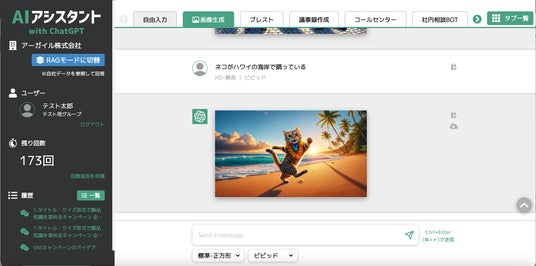 OpenAI社のDALLE-3を用いた、画像生成機能が新たにリリースされました。日本語文章による指示で、画像を生成します。実写風CGの他、イラスト風、アニメ風、シンプルな白黒のロゴマークなども簡単に生成可能です。また、出力される画像のサイズ(縦長、横長、正方形)や解像度(HD、標準)、描画トーン(ビビッド、ナチュラル)も指定できます。画像URLのコピー、ダウンロードなどのボタンで手軽に保存・共有ができます。