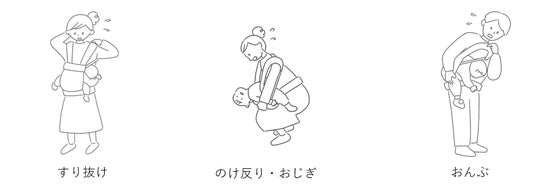 <すり抜け>首すわり前の乳幼児が抱っこひもの横の隙間から滑り落ちそうになる <のけ反り・おじぎ>首すわり後の乳幼児がのけ反るパパママがお辞儀のような姿勢をすることで飛び出てしまう <おんぶ>抱っこからおんぶへお子さまを移動するときに落ちそうになる