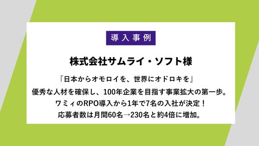 ワミィ株式会社は、エンジニア採用代行(RPO)として支援を行った株式会社サムライ・ソフトの成果事例を本日公開いたします。
