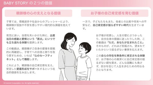 ・出産を感動的に記録する「ファーストメッセージムービー」として誕生し、子どもに対する愛着形成と子どもの自己肯定感の向上に寄与。