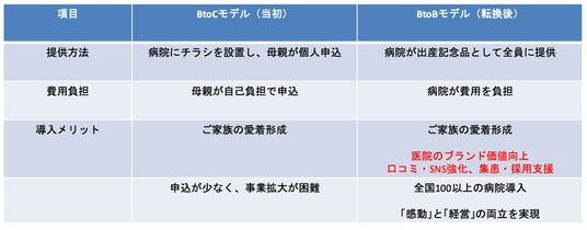 開始当初はチラシのみ医院に設置するBtoCでの導入で反応が得られず苦戦しましたが、相談した経営者からのフィードバックにより「医院側に具体的な利益を示す必要がある」との洞察を得ました。そこから、ユーザーが個人負担で申込むのではなく、医院側の出産記念品として「出産したご家族全員にプレゼント」するモデルで提案を開始し、その後、SNSや口コミ活用を含めた経営支援型のBtoB型のサービスへ転換した。これによって現在は感動と経営支援の両立を実現しました。