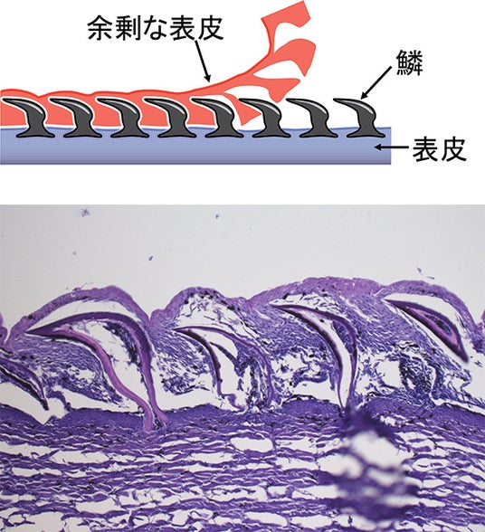 図2:ネズミザメ胎仔の表皮断面の顕微鏡写真。鱗の外側を一枚余剰な表皮が覆っている。