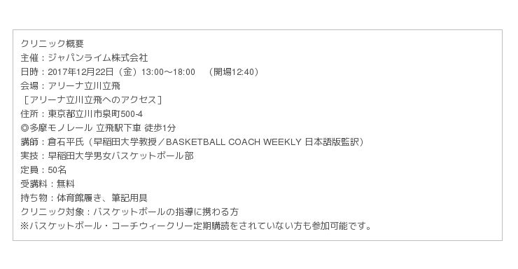 2017年12月22日@アリーナ立川立飛「バスケットボール・コーチウィークリー・クリニック」開催