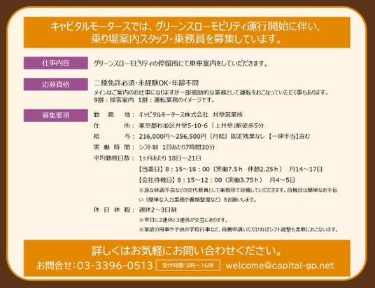 キャピタルモータース株式会社(東京都杉並区・代表:磯 史洋)は「杉並区グリーンスローモビリティ」の運行事業者として荻窪駅南側を中心に運行を開始致しました。乗り場案内スタッフ・乗務員も募集しています。