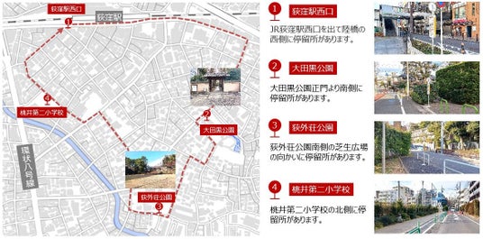 荻窪駅南側地域を1から4の順に周回する、1周約2.5kmの路線です。