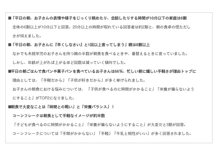 本調査では、朝の忙しい時間でどのようにお子さんとのコミュニケーションを取っているのか、特に朝ごはんについての様子が明らかになりました。