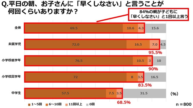 「平日の朝、お子さんに『早くしなさい』と1回以上言ってしまう」親は8割以上