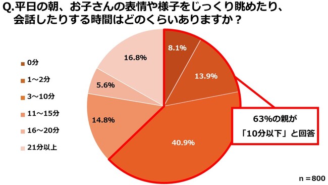 平日の朝、何かをしながらではなく、お子さんのことを見て、表情やその日の様子をじっくり眺めたり、会話したりする時間については、63%の親が10分以下と回答。20分以上の親は全体の2割以下となりました。忙しい朝はお子さんとなかなかゆっくりと過ごせないという様子が伺えます。