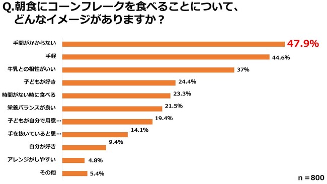朝食にコーンフレークを食べることへのイメージについて調査したところ、「手間がかからない(48%)」「手軽(45%)」なイメージがあり、次いで「牛乳と相性がいい(37%)」という回答がありました。忙しい朝の味方である印象が持たれているようでした。