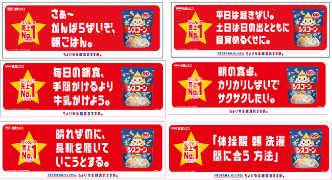 シスコーンは、発売60周年を機に、「みんなの朝をもっとHappyに!」を掲げ、これからも多くの方に笑顔 を提供していきます。一方、この度、お子さんのいる家庭を対象とした調査を通じて、朝、子どもの顔をゆっくり見られる時間が10分以下であるという家庭が6割を占めるということが分かりました。「忙しい朝の朝食は頑張りすぎずもうちょっとゆるくてもいい」という思いからシスコーンは“ちょいゆる朝食“をメッセージに掲げ、その一環として「忙しい朝の食卓のあるある」をコピーにした計10種のデザインを制作にしました。大阪などは5月1日(月)から、東京・名古屋・広島は5月15日(月)からそれぞれ屋外に掲出します。