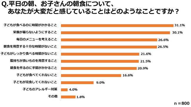 平日の朝のお子さんの朝食について大変だと感じていることについて、「子どもが食べるのに時間がかかること(31%)」「栄養が偏らないようにすること(30%)」「毎日のメニューを考えること(27%)」と回答し、忙しい朝の時間に子どもが自らすすんで食べてくれて、栄養バランスが良く、手軽に準備できる朝食が求められていることが分かりました。