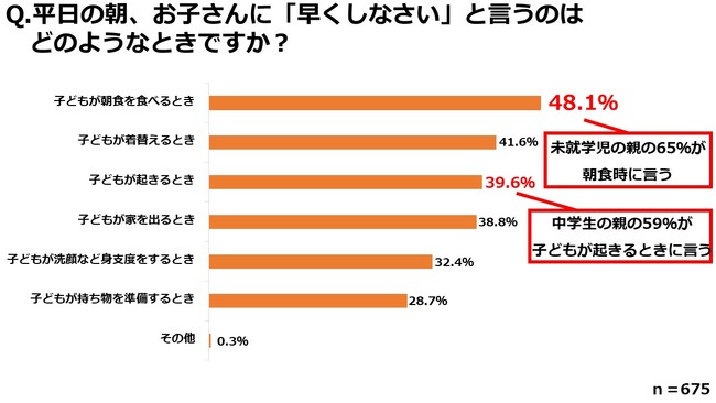 「早くしなさい」と言うタイミングについては、「子どもが朝食を食べるとき」が全体の48%と最も多く、朝の食卓の忙しさが伺えました。特に、未就学児のお子さんがいる親の場合は65%と他の学年よりも高くなりました。一方で、中学生の子どもがいる親では「子どもが起きるとき」が最も多い理由でした。
