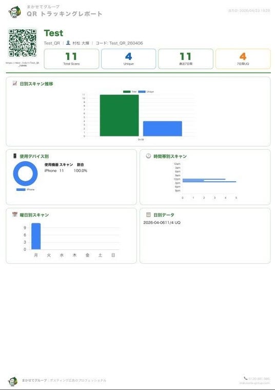 - 反響の「可視化」チラシに印字された専用QRコードを通じて、日別・曜日別・時間帯別・端末別のアクセス推移をリアルタイムで集計。配布開始直後から、ターゲットがどのタイミングで反応したかを定量データで確認できます。