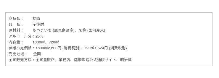 原材料:さつまいも、米麹 アルコール分:25度、20度 内容量:1.8L/900mL/720mL