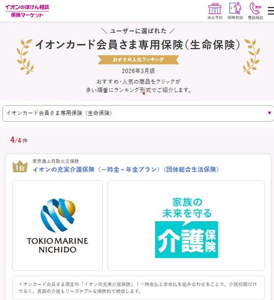 イオン保険サービス株式会社(本社:千葉県千葉市、代表取締役社長:角谷 修一)は、保険選びの「むずかしい」を解消し、お客さまがより納得感を持ってプランをお選びいただけるよう、2026年3月2日(月)に「イオンのほけん相談 保険マーケット」の商品ページと保険料比較機能を大幅にリニューアルいたしました。新しくなった「保険マーケット」が、これまで以上にスムーズで安心な保険選びをサポートします。
