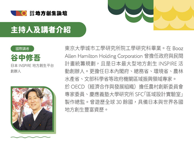 国内最大級の地方創生イノベータープラットフォーム「INSPIRE」を主宰する一般社団法人INSPIRE(本社:東京都渋谷区)創設者の谷中修吾代表理事(BBT大学大学院 経営学研究科 MBA 教授)は、台湾政府の国家発展委員会が2023年5月1日(月)に台北市で開催した地方創生フォーラムにおいて、日本の地方創生の現状とイノベータープラットフォームの集合知を解説する基調講演を務めました。本フォーラムには、蔡英文総統(大統領)、陳建仁行政院長(首相)らが出席し、台湾各地で地方創生に取り組むキープレーヤーが集結して各自の成果を発表しました。日本からの特別ゲスト(国際有識者)として基調講演を務めた谷中修吾代表理事は「台湾と日本で突き抜けた地方創生交流を進めていきたい」と強調しました。