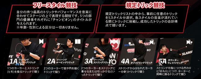 【競技ヨーヨーとは】3分間の音楽に合わせて演技を行い、技術とパフォーマンスを審査し競う「フリースタイル競技」を中心に、世界中で競われている国際スポーツ。プレイスタイルによって大きく5つの部門(1A~5A)に分かれており、各スタイル別に競技が行われます。