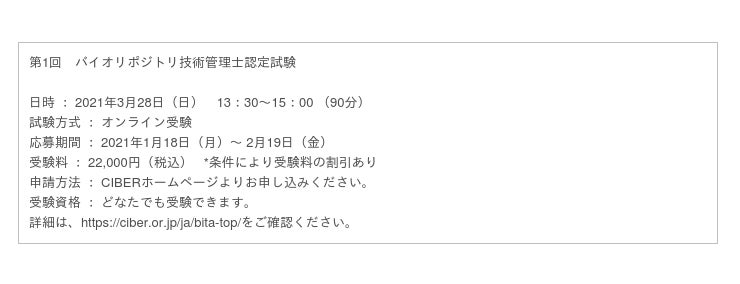 一般社団法人日本生物資源産業利用協議会(CIBER)では、バイオバンクやバイオリソースセンターで働く方の認定試験として、バイオリポジトリ技術管理士(BiTA)認定試験制度を立ち上げ、第1回認定試験を、2021年1月24日(日)、東京大学医科学研究所にて実施する予定で鋭意準備を進めてまいりました。しかしながら、新型コロナウイルス感染拡大を受け、会場での試験を取り止め、試験日を延期してオンライン試験での実施へ変更する運びとなりましたので、ここにお知らせいたします。
