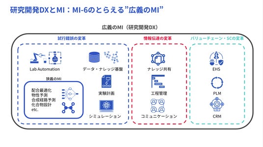 miHubでは、本質的な研究開発業務のDXを実現するため「広義のMI」に取り組むためのソリューションを提供しています