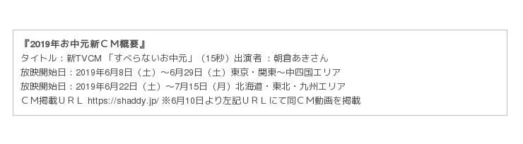 シャディ株式会社(本社:東京都港区、以下「当社」という)は2019年6月8日(土)より、お中元の新CMを全国エリアにて放映を開始いたしましたのでお知らせいたします!当社のテレビCMの放映は2012年以来7年ぶりとなります。