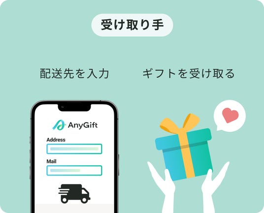 『AnyGift(エニーギフト)』は、お相手の住所を知らなくても、LINEやメール・SNSのDMなどで受け取りURLを送ることでギフトを相手に贈れるサービスです。URLを送った後にお相手が受け取り住所を入力することで、購入した商品がギフトとして届きます。