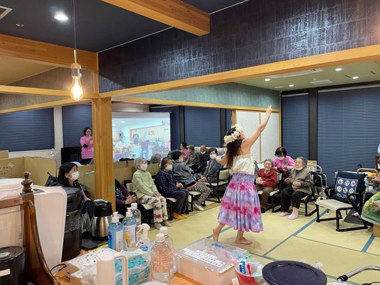 フラダンスショーを楽しむ勝山福祉避難所の被災者導入後、恐竜大スクリーン(TM)を通じて被災地外からボランティア団体などによる軽度な運動教室やフラダンスショーなどコンテンツを提供してきました。その結果、「一緒に体操しましょう」などの高齢者同士の声がけや、体験を通じた思い出の共有等が日常の中に現れ、慣れない避難所生活により生じる心理的負担の軽減に貢献しております。
